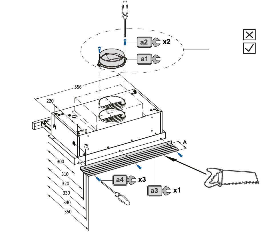 Вытяжка устанавливается внутри навесного кухонного шкафчика на рекомендуемой высоте 65-75 см от рабочей поверхности до нижней точки прибора. Желательно использовать минимум соединительных элементов для воздуховода и соблюдать диаметр вентиляционных труб не менее, чем диаметр выходного отверстия. В режиме рециркуляции необходимо устанавливать угольный фильтр.